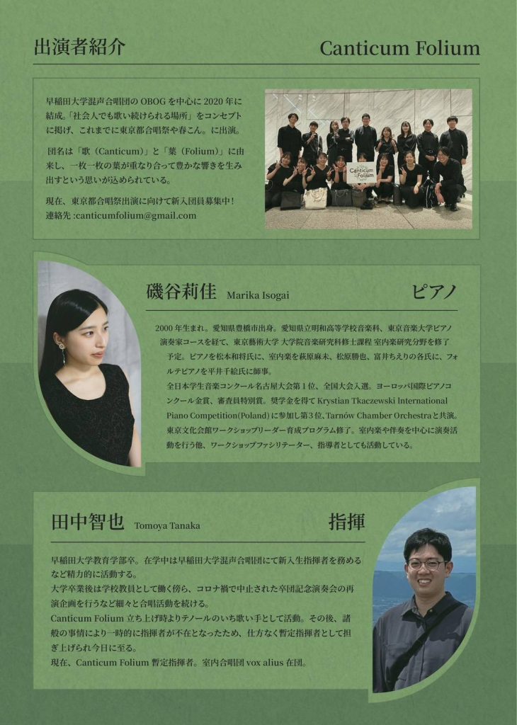 2020年、70期生と当時の在団生を中心に、社会人でも歌い続けられる場として結成。これまで「東京都合唱祭」と「春こん。」に出場。現在、70期〜75期までの卒団生が在籍する。団名には一枚一枚の葉(folium)が重なるように豊かな響きを作っていくという思いが込められている。
